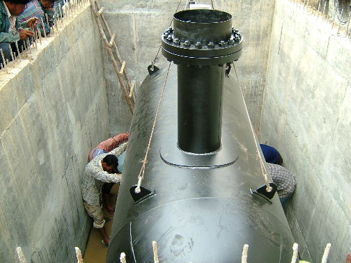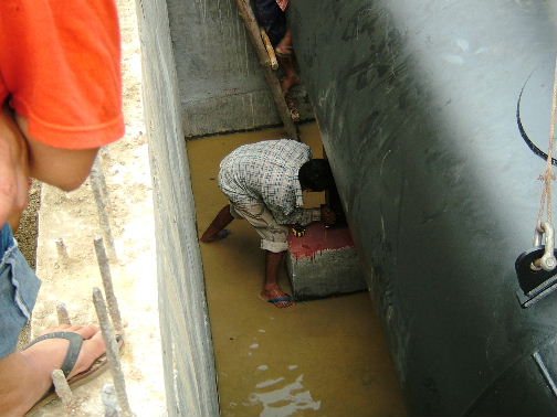 เริ่มลงไปถึงตอม่อของขาถังแล้ว โอย....โล่งอกครับ แบบสบายๆแต่ต้องรองขาค้ำของรถ hiab ไม่ให้ยุบตัวได้เลยนะ ไม่งั้นรถ hiab จะเอียงแล้วเสียการทรงตัวอาจพลิกได้ เพราะตัวถังเก็บแก๊บหนักถึง 3.2 ตัน