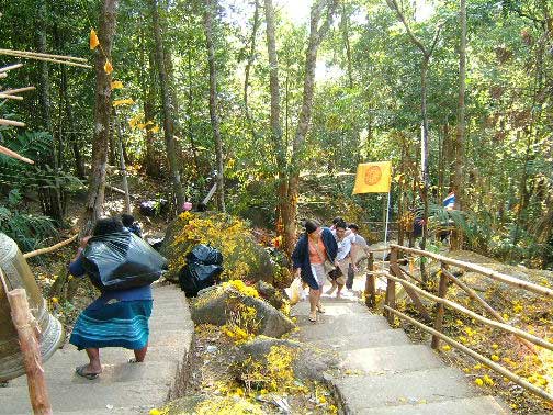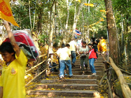 ระหว่างทางเดินขึ้นเขาจะมีผ้าแดงผูกตลอดทาง ผู้เฒ่า-ผู้แก่ ว่ากันว่าห้ามเดินออกนอกผ้าแดงครับ เพราะด้านนอกผ้าแดงจะมีวิญาณต่างๆ มากมายครับ (แล้วแต่ความเชื่อของแต่ละบุคคลครับ)