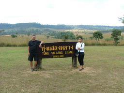 หน้าศูนย์บริการนักท่องเที่ยว อช.ทุ่งแสลงหลวง ด้านซ้ายมือบริเวณป่าสนมีบ้านพักและที่กางเต้นส์