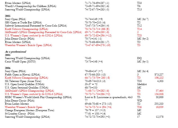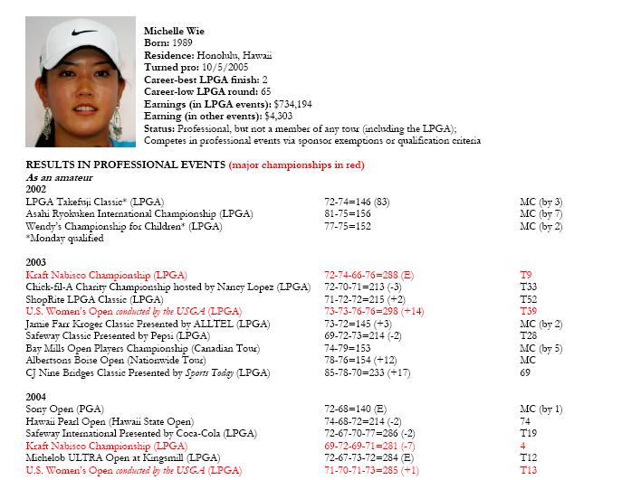 ^ a b c d e f Michelle Wie Profile and Statistics. LPGA.com (2006-12-23). Retrieved on 2007-03-30.