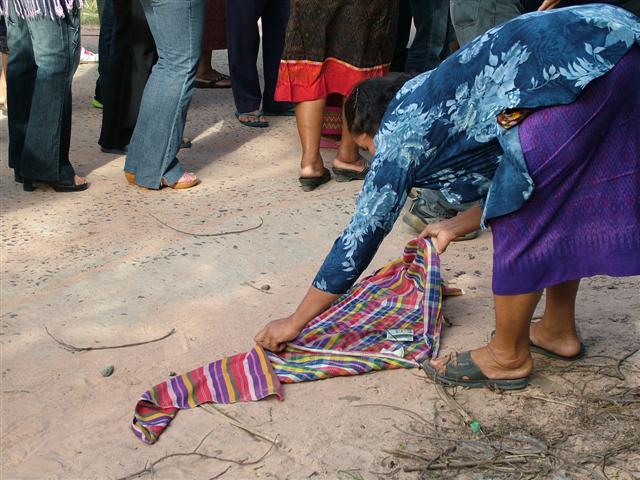 ปูผ้าต้อนรับขบวนให้ผ่านหน้าบ้านเพื่อเป็นศิริมงคล