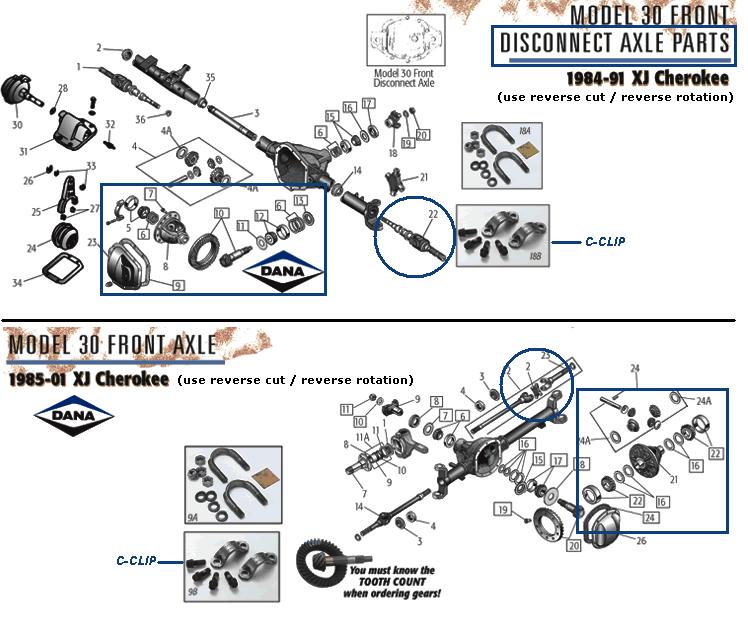 Dana 30 high pinion - reverse cut - 27 spline, 1.16" diameter shafts, 7.13" ring gear - used 84-99 (some axles through 91 are vacuum disconnect, 92+ are non-disconnect, 89-95 with ABS have 5-297x u-joints, all 95+ have 5-297x u-joints, all others have 5-260x u-joints)
