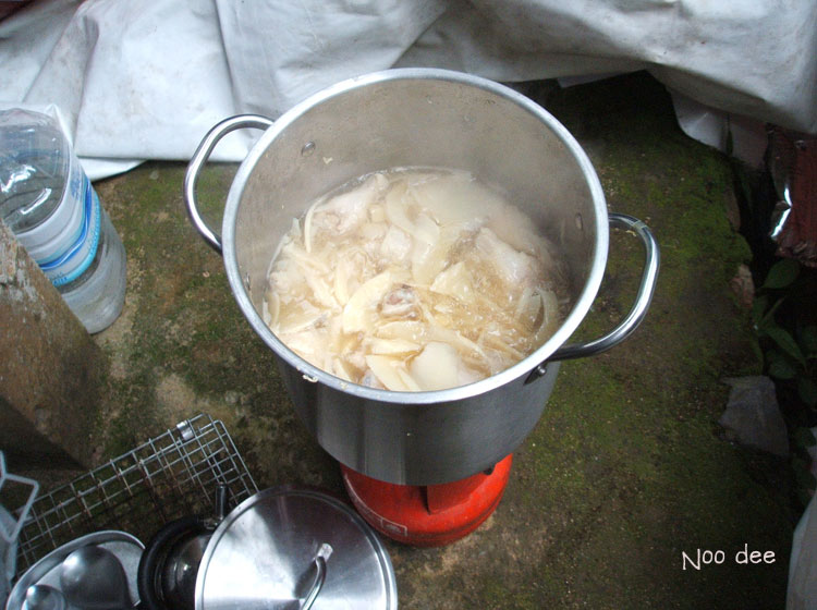 อาหารหลักของเรา.....หน่อไม้ตรึมเลยค่ะ....ลุงพันให้เก็บไปฝากเพื่อนบ้าน....เล่นซะเกือบหมดป่า.....อิๆ หน่อไม้สด ๆ นี่หวานจริง ๆ ค่ะ