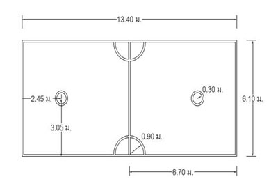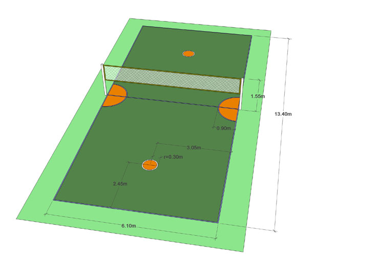 1.1 สนาม พื้นที่ของสนามมีความยาว 13.40 เมตร และกว้าง 6.10 เมตรจะต้องไม่มีสิ่งกีดขวางใด ๆ วัดจากพื้นสนามสูงขึ้นไป 8 เมตร (พื้นสนามไม่ควรเป็นหญ้าหรือสนามทราย)