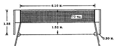 3.2 ตาข่ายให้มีแถบหุ้มขนาดกว้าง 5 เซนติเมตร ทั้งด้านบนและด้านล่าง โดยมีลวดหรือเชือกไนล่อนอย่างดีร้อยผ่านแถบ และขึงตาข่ายให้ตึงเสมอระดับหัวเสา ความสูงของตาข่ายโดยวัดจากพื้นถึงส่วนบนของตาข่ายที่กึ่งกลางสนามมีความสูง 1.52 เมตร สำหรับชาย และสำหรับหญิง 1.42 เมตร และวัดตรงเสาทั้งสองด้าน มีความสูง 1.55 เมตร สำหรับชาย และสำหรับหญิง 1.45 เมตร