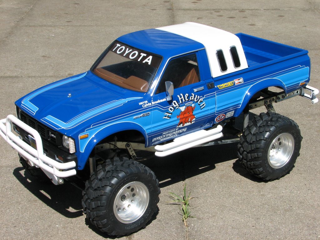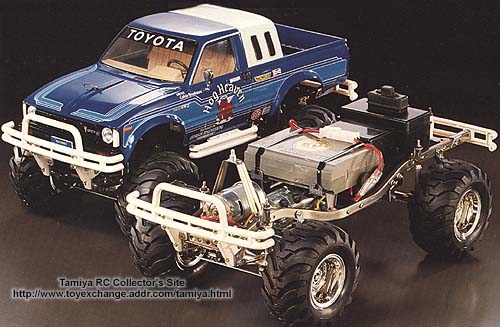 ของ Tamiya ครับ หาซื้อได้ทั่วไป เรียกว่ารถ scale ต้องประกอบเองทุกชิ้นครับ ที่มีขายตอนนี้จะเหลือ Toyota ม้ากระโดด , Ford F-350 และรุ่นล่าสุดจะทำออกมาเป็น Toyota Tundra ราคาขายในไทยประมาณหมื่นกลางๆครับ (เฉพาะตัวรถ ไม่รวมชุดบังคับ ฯลฯ ) ถ้าครบชุดระบบไฟส่องสว่าง และเพิ่งกล่องเสียงเครื่องยนต์ ก็จะอยู่ประมาณ 5 หมื่นครับ