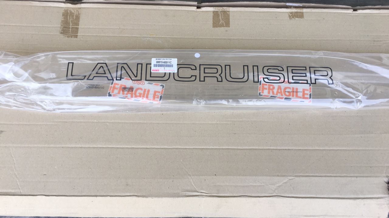 สีขาวใส มีตัวหนังสือ LANDCRUISER ขนาดความกว้าง 5 นิ้วครึ่งเล็กกว่าของสเป็กญี่ปุ่น