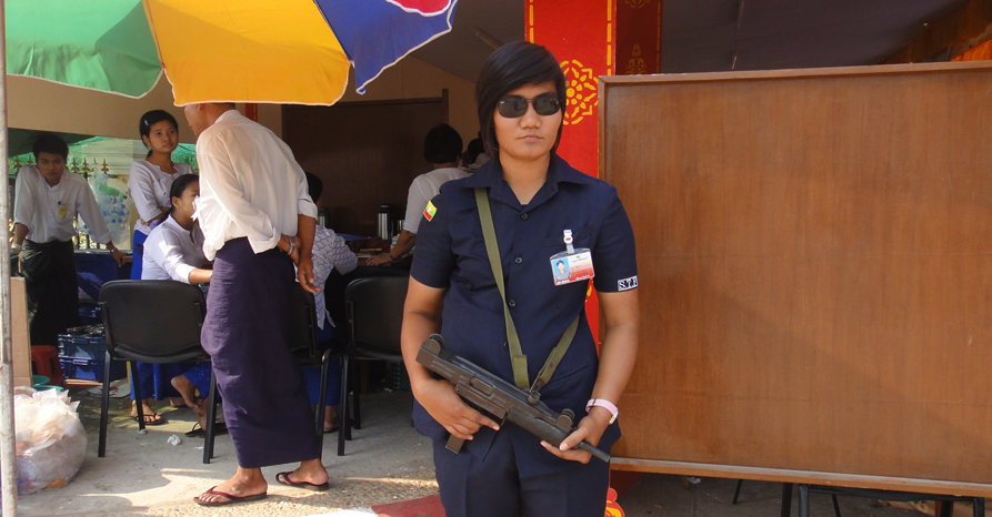 ทหารสาวเมียนมาร์ หน้าลานจอดรถของเหล่าผู้นำทหาร