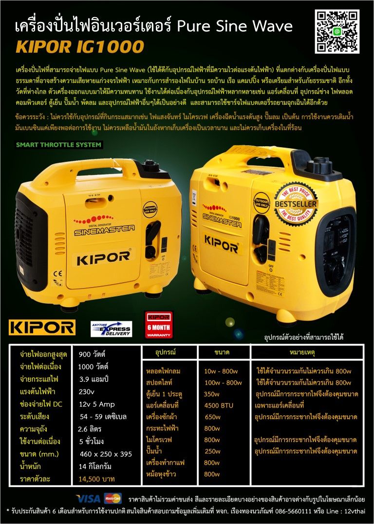โปรแรงอีกครั้งครับ จัดรายการการสินค้าหน้าตู้ เครื่องปั่นไฟ KIPOR IG1000 พิเศษที่จ่ายไฟแบบ Pure sine wave ทำให้อุปกรณ์ไฟฟ้าไม่เสียหาย และเป็นแบบเก็บเสียง มีขนาดจ่ายไฟต่อเนื่อง 900 วัตต์ และจ่ายสูงสุด 1000 วัตต์ (ช่วงสั้นๆ) สินค้าขาดตลาดไปนาน จัดรายการ 6 ชุด เพียง 12999 บาทจากราคา 14500 บาท ถึงวันที่ 20 กันยายน 2561 นี้เท่านั้น หรือจนกว่าสินค้าจัดรายการจะหมดครับ