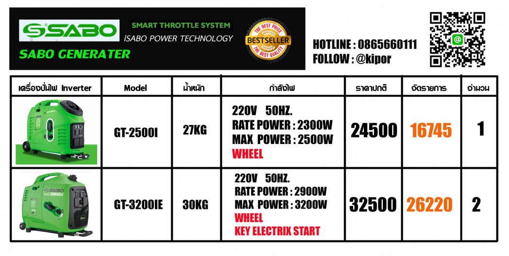 เครื่องปั่นไฟ Inverter เก็บเสียงแบบหิ้วได้จาก I-SABO Technology มีขนาดตั้งแต่ 1000 วัตต์ - 3200 วัตต์ สำหรับงานกลางแจ้ง กู้ภัย สำรองไฟบ้าน รถบ้าน แคมปิ้ง เรือ มีทั้งแบบมีล้อ และสตาร์ทไฟฟ้า ด้วยแบตเตอรี่ Lithium จ่ายไฟแบบ Pure Sine Wave ทำให้อุปกรณ์อิเล็กโทรนิคไม่เสียหาย