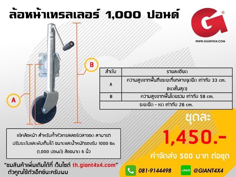 ล้อหน้าเทรลเลอร์ สามารถปรับระดับสูงต่ำ และ สามารถพับเก็บได้ รับน้ำหนักได้ถึง 1,000 ปอนด์