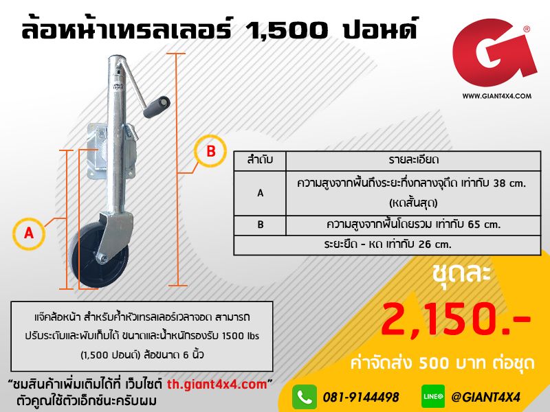 ล้อหน้าเทรลเลอร์ สามารถปรับระดับสูงต่ำ และ สามารถพับเก็บได้ รับน้ำหนักได้ถึง 1,500 ปอนด์