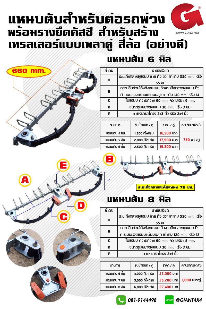 ราคา รางแหนบแบบเพลาคู่ พร้อมแหนบ 4 ชั้น คู่ละ 16,500 บาท + ค่าบริการจัดส่งไปรษณีย์ โลจิสโพสท์ คู่ละ 750 บาท (สามารถรับน้ำหนักสูงสุดได้ที่ 1.5 ตัน)
