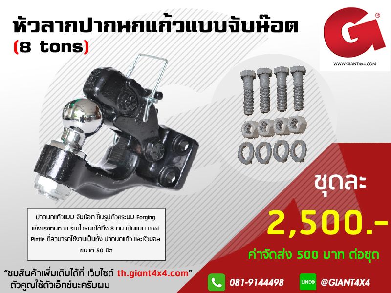 ปากนกแก้วแบบ จับน๊อต ขึ้นรูปด้วยระบบ Forging แข็งแรงทนทาน รับน้ำหนักได้ถึง 8 ตัน เป็นแบบ Dual Pintle ที่สามารถไช้งานเป็นทั้ง ปากนกแก้ว และหัวบอล ขนาด 50 มิล