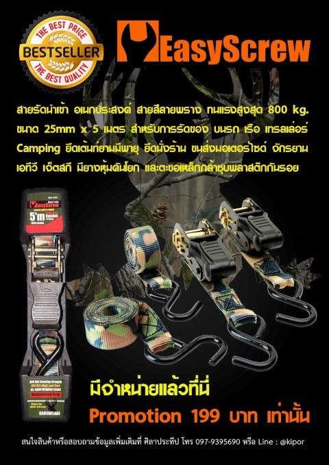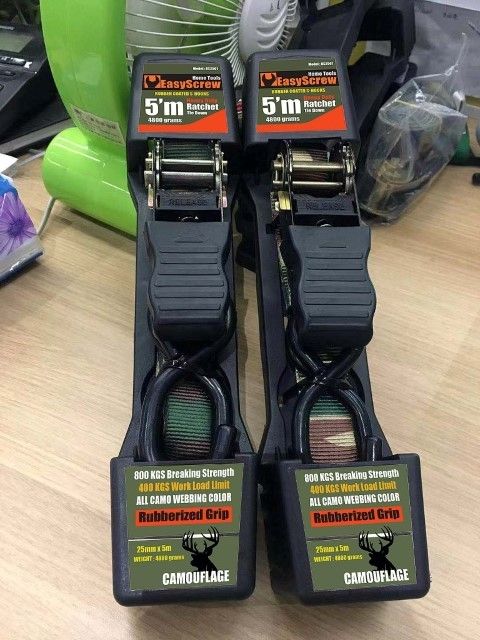 สายรัดอเนกประสงค์นำเข้า EasyScrew ผลิตด้วยความหนาแน่นของสายผ้าใบสูงมาก ได้ค่าแรงดึงสูงสุดถึง 800 กิโลกรัม (ค่าจริงจากการทดสอบที่ 827 KGS) ขนาด 25mm x 5 เมตรสีลายพรางสวยงาม มียางหุ้มคันโยก ตะขอเหล็กกล้าชุบพลาสติกกันรอย