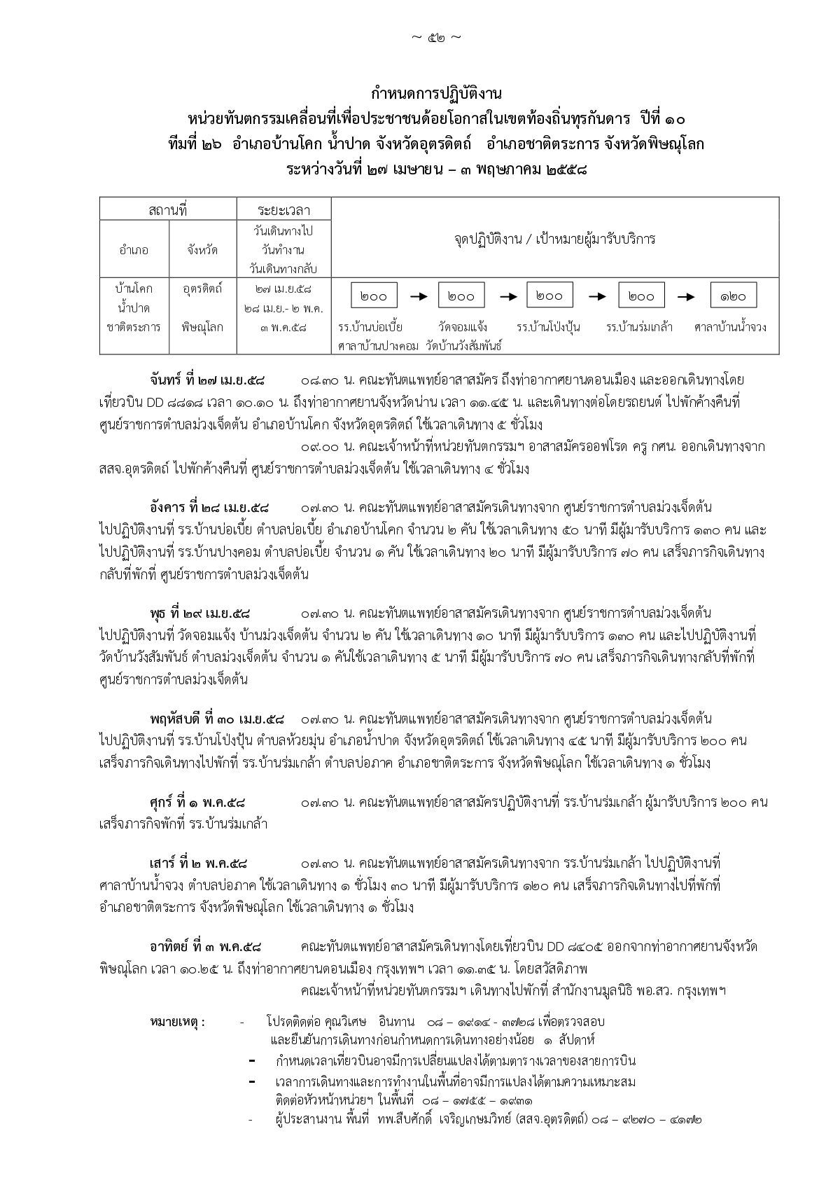 หน่วยทันตกรรมเคลื่อนที่เพื่อประชาชนด้อยโอกาสในเขตท้องถิ่นทุรกันดาร มูลนิธิ พอ.สว. ปีที่ ๑๐ ทีมที่ ๒๖ ออกให้บริการใน อ.บ้านโคก อ.น้ำปาด จ.อุตรดิตถ์ อ.ชาติตระการ จ.พิษณุโลก ระหว่างวันที่ ๒๗ เมษายน - ๓ พฤษภาคม ๒๕๕๘