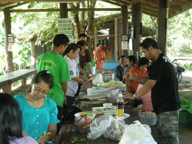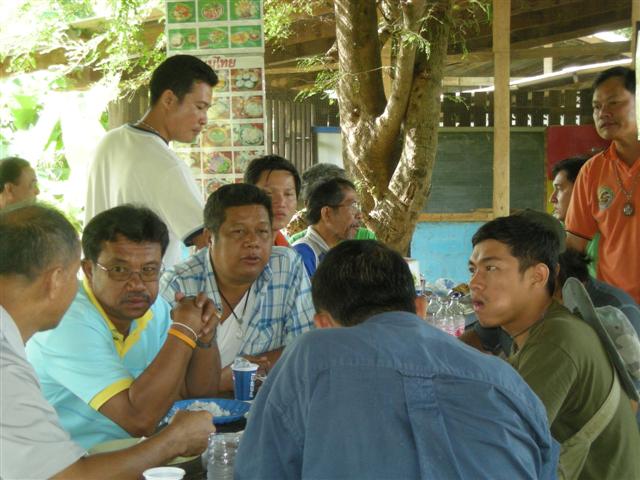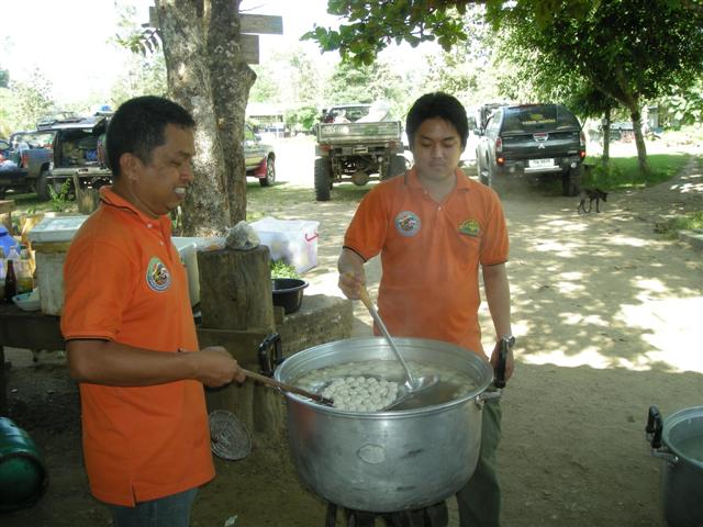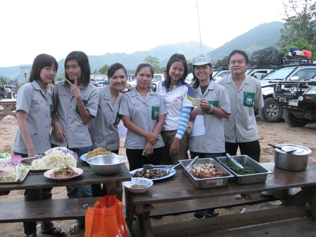 ลงมาจากนำตกตัวก้อแห้งพอดี ( คิดดูซิคะ นำตกที่ว่าใกล้ เดินไปทุกเสาร์ - อาทิตย์หน่ะจะขนาดไหน ) ด่านแรก กระดูกหมูทอดของ ท่านประธานอู๊ด และทีมพ่อครัว อร่อยเหาะ ขาดข้าวเหนียวแค่นั้นเอง ( เฮ้อ ! แต่ไอ้แค่นี้ ก็เรียกพลังได้มากโข) โฮ้โห! ยิ่งมาได้เห็นคุณลุงกับพี่ ๆ OFF ROAD เพียบ ( ไอ้เพียบนี่ หมายถึง เยอะแยะมากมายนะคะ ไม่ใช่ เมาหนัก เมาเพียบนะคะ เพราะพี่เค้ารู้ พอประมาณ )ที่เนรมิตลาน หน้าที่พักให้เป็นเหมือน สวนอาหาร อาหารเยอะแยะจัดมาทานด้วยกัน ( รวมทั้งกระดูกหมูที่แอบทานก่อนนั่นด้วย ) แถมพี่อ๋อง ยังขับรถเปิดไซเรน Delivery หมูหัน สลัดผักกรอบ ๆ ขนมเค้กของ อจช. อร่อยสุด ๆ มีส้มจากกำแพงเพชร เปลือกไม่สวยแต่หวาน....นซะ จนต้องจองเพิ่มอีกลูก ปากเป็ดทอดแสนอร่อยที่คุณลุงณรงค์ต้องฝืนแบ่งให้ แต่ก็ไม่ได้ลืมลูกชิ้นนครสวรรค์ที่ทำให้ก๋วยเตี๋ยวอร่อยจนต้องคิดแผนซุ่มมาขอแบ่งมาเพิ่มอีกหม้อนะคะ ( ตอนแรกเห็นไซเรน ตกใจนิดหน่อย คิดว่าตำรวจมาจับเหล้าเถื่อน แต่ เอพี่บูก็อยู่ พี่เป็กก็นั่งนั่น คงไม่ใช่มั้ง มั่นใจสุด ๆ ตอนเห็นว่าเป็นรถพี่อ๋อง เฮ้อ! โล่งแทน....กินต่อ )