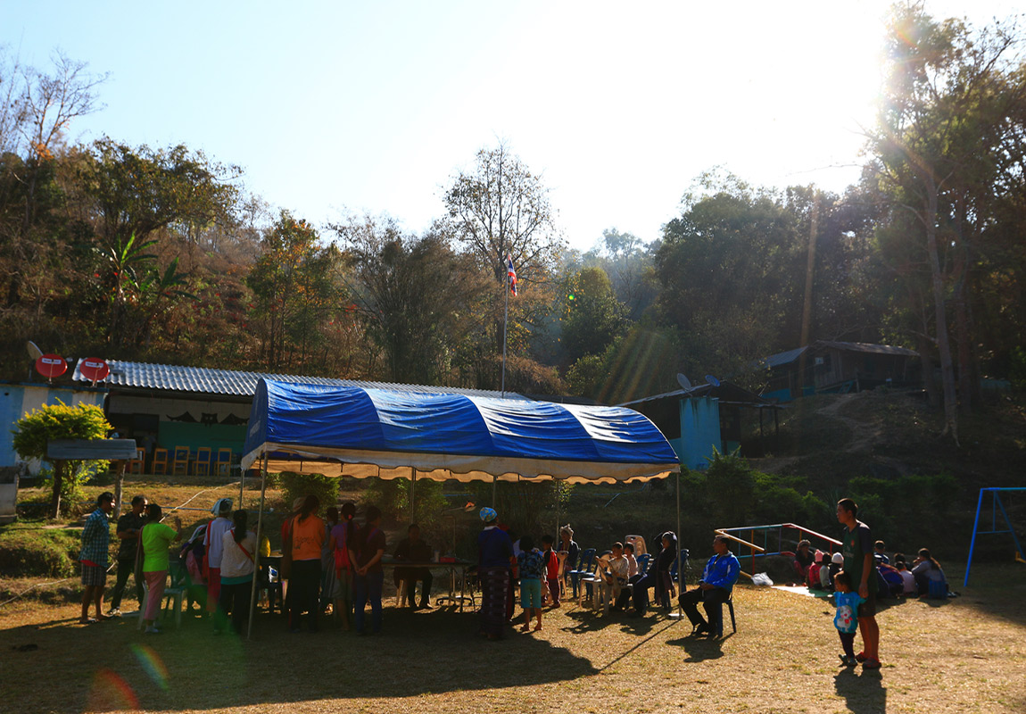 ด้านหน้าอาคารที่ทำการรักษา ทั้งหมออาสาและออฟโรดอาสา ทั้งทำงานและแจกยาสีฟันช่วยกันไป