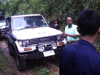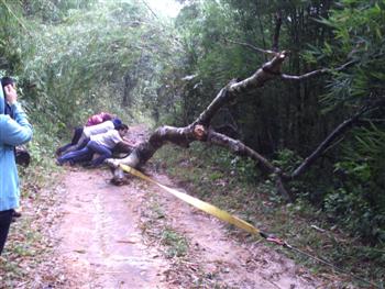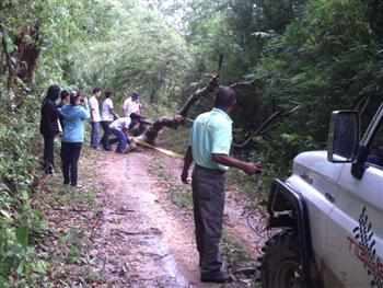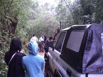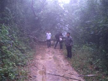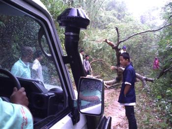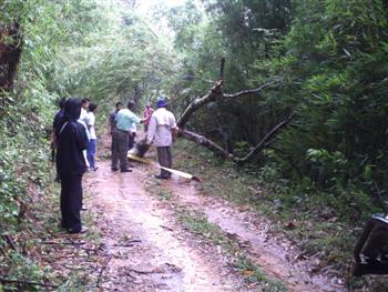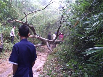 วันที่สอง(อาทิตย์ที่ 3 ต.ค.)ของการปฏิบัติงาน แบ่งออกเป็น 2 สาย สายที่ 1 ไปโรงเรียนบ้านห้วยจะกือ(โรงเรียนขนาดใหญ่) สายที่ 2 ไปโรงเรียนบ้านห้วยช้างไล่(โรงเรียนขนาดเล็ก) ในภาพเป็นเส้นทางของสายที่ 2 ชุดนำทางรถเครื่องมือและหมอ เจองานเข้าแต่เช้าต้นไม้ล้มขวางทาง