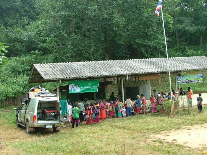 เริ่มลงมือทำงานกันทันทีเนื่องจากเราเสียเวลาในการเดินทางค่อนข้างไกล กะว่าวันนี้คงจะเย็นมากเพราะเมื่อมาถึงเราเห็นชาวบ้านจำนวนไม่มากนัก ต่อมาถึงได้รู้ว่าด้านหลังหน่วยบริการเป็นเขาด้านบนมีวัดและวันที่เราไปถึงมีญาติโยมจากอ.วังเจ้ามาทอดกฐินที่วัดนี้ จนพักใหญ่ชาวบ้านเริ่มทยอยลงมาต็มไปหมด