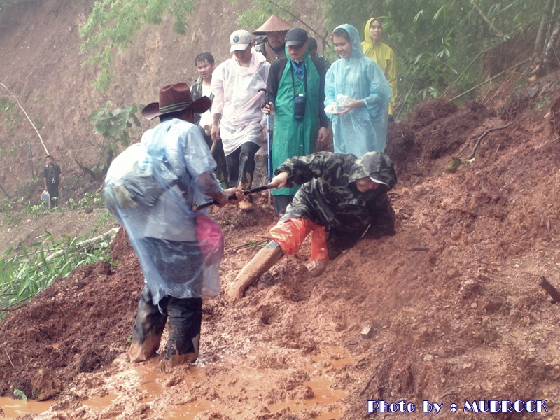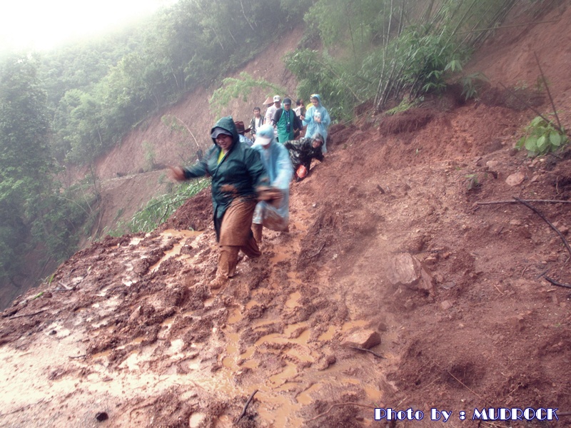 หลังจากเดินฝ่ากระแสน้ำ ระยะยาว เดินเท้าต่อ ผ่านบ้านสบโขง มุ่งหน้า ไป บ้านผาแดง เจอดินโคลนถล่ม ปิดเส้นทาง ต้องค่อยๆ ประคองกันไป เพราะโคลน ลึกมาก เลยเข่า ครับ ต้องช่วย กัน ดึง ผ่านโคลนเลน ให้ ผ่านที ละคน พลาดไม่ได้ครับ เพราะ ซ้ายมือ ไม่เกิน 50 ซม. เป็น หน้าผา สูง กว่า 100 เมตร