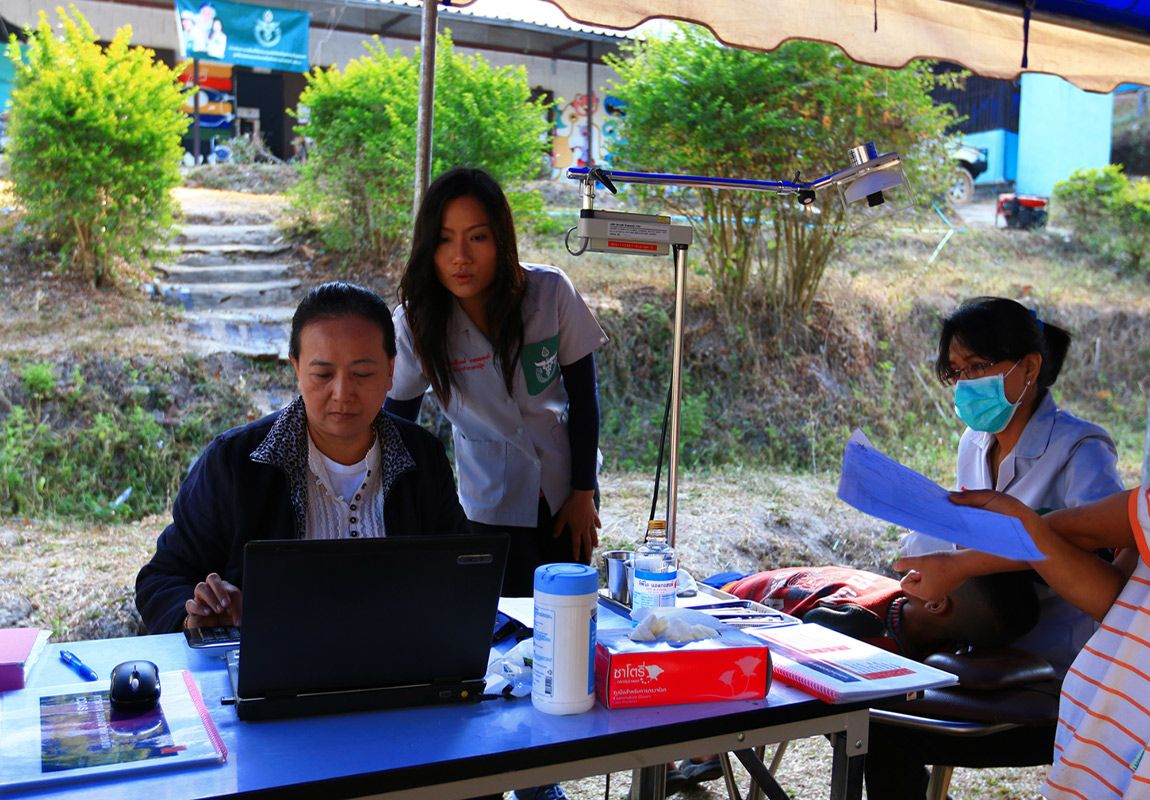 เจ้าหน้าที่วิจัยจาก ม. เชียงใหม่ พี่จี๊ด หมอแหว๋ว พี่กลอย กำลังลงประวัติเด็กๆ