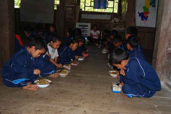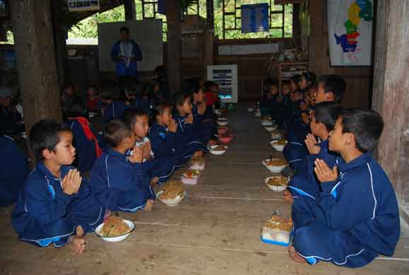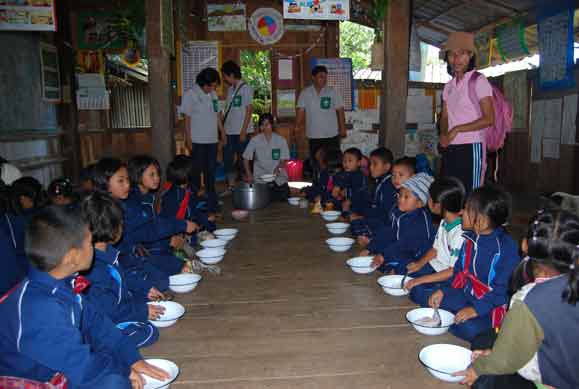 พอได้เวลาอาหารกลางวันเด็กก็เตรียมถ้วยจานพร้อมช้อน