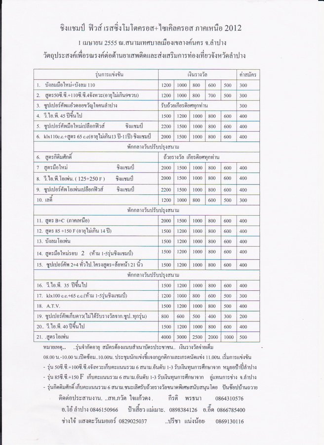 "เขลางค์โมโตครอส&ชิงแชมป์ฟิวส์เรสซิ่งภาคเหนือ สนามที่ 2" 1 เมษายน 2555 งานแข่งขันโมโตครอส กับนโยบายเล่นกีฬาเพื่อต่อต้านยาเสพติดและส่งเสริมการท่องเที่ยวจังหวัดลำปาง.... สนามใหญ่ใจกลางเมืองลำปาง.... ซึ่งผมมีโอกาสไปดูการสร้างสนามแล้วงานนี้คงต้องยืนขี่กันล่ะครับพี่น้อง เนินเยอะจริงๆ...ห่างหลักกิโลยักษ์ไปศูนย์ราชการเพียง 500 เมตร รายละเอียดต่างๆจะตามมาเร็วๆนี้ครับ
