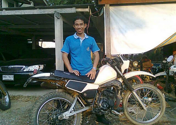 ตอนนี้สมาชิกใหม่ของผมเดินทางมาถึงแล้วครับ เมื่อตอนเช้านี้เอง ทำการรับมอบกันเสร็จเรียบร้อย โดยมีประวัติความเป็นมาดังนี้ เจ้าคันนี้เคยรับใช้ชาติมาก่อน โดยเป็นมอไซน์วิบากของ สภ.จังหวัดอุตรดิตถ์ มีการประมูลขายเมื่อปี 40 แล้วไปอยู่ที่เมืองแพร่ เจ้าของแก่แล้วโดยเป็นพ่อตาของคนที่ขับมาส่ง คันนี้ผมไม่ได้เจอในเว็บเองหรอกครับ แต่เป็นเพราะพี่ป๋องพี่ชายผมที่สุดหล่อไปเจอ แล้วกรุณาก๊อบมาไว้ในเว็บของเรา ผมจึงโทรไปถาม พี่ป๋องบอกว่า น่าจะไม่เหลือแล้วล่ะเพราะมาเจอช้าไป 1 วัน ผมเลยลองโทรไปถามเจ้าของ เขาก็บอกว่ามี 2-3 รายสนใจจะมาดูรถและทำการมัดจำ ผมจึงขอต้ดหน้าวางมัดจำก่อนเลย อีกอย่างลูกเขยซึ่งเป็นคนทำการขายก็เป็นคนชัยนาทพอดี เขาก็เลยให้ผมโดยไม่ต้องคิด (เขามาแจ้งตอนรับรถว่า ตอนนี้ที่คุยตกลงกับผมวางมัดจำ อีกคนก็เป็นสายซ้อนจะโทรมาเพื่อตกลงวางมัดจำเหมือนกัน)