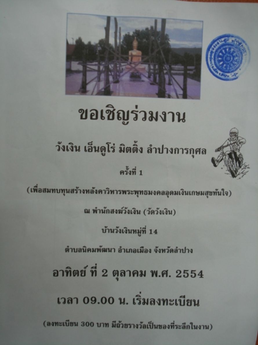 ขอเชิญร่วมงานวังเงินเอ็นดูโร่ มิตติ้งลำปางการกุศลครั้งที่1 ในวันที่ 2ตุลาคม 2554ที่จะถึงนี้ครับ รายได้หักค่าใช้จ่ายแล้วจะบริจาคให้ทางวัดเพื่อสมทบทุนสร้างวิหารหลวงที่ยังขาดปัจจัยและอุปกรณ์อีกหลายอย่างครับ