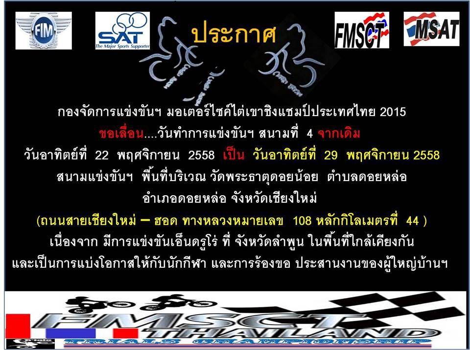 ..รายการแข่งฯนี้ได้รับการรับรองจากสมาพันธ์การแข่งขันจักรยานยนต์แห่งประเทศไทย ถูกต้องทุกประการ อย่าเชื่อคำแอบอ้างของบุคคลบางคนที่ไม่มีสิทธิ์ลงแข่งเพราะขาดคุณสมบัติฯแล้วพาลตัดท้อต่อว่าในสิ่งที่ไม่ถูกต้องต่างๆนาๆ..โปรดใช้วิจารณญาณในการอ่านของบุคคลคนนั้น.
