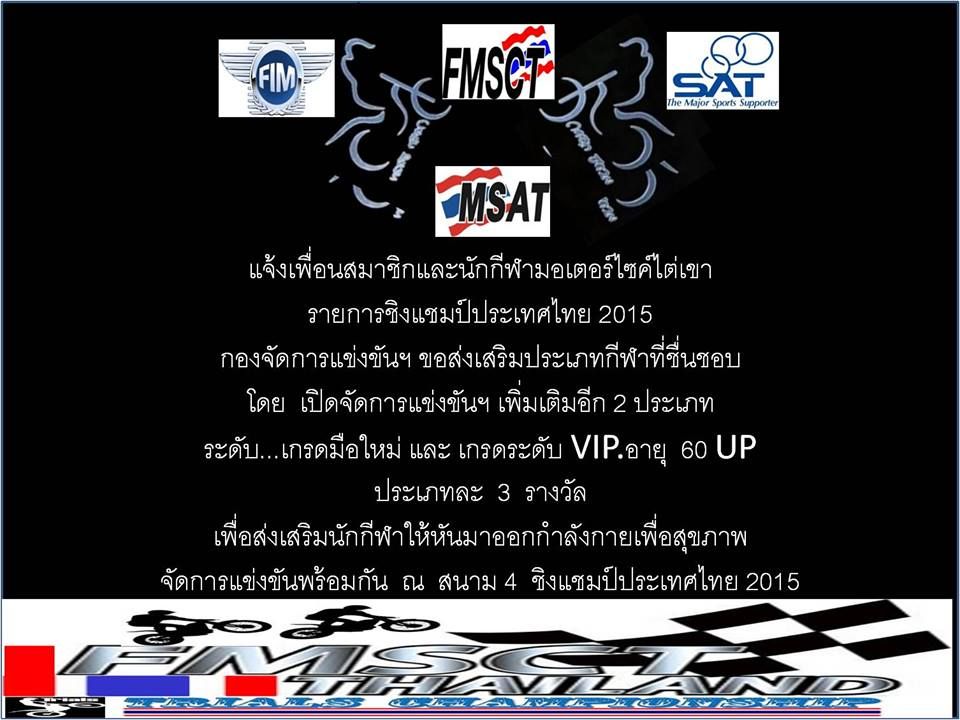 ..ติดตามเรื่องราวที่น่าสนใจเกี่ยวกับการแข่งขันมอเตอร์ไซค์ไต่เขาชิงแชมป์ประเทศไทย ประจำปี2558 สนามที่4 สนามสุดท้ายของปีได้..