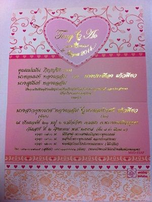 เพื่อเป็นเกียรติ์และพยานรักกับหนุ่มสาวทั้งสองให้ครองคู่กันยืนยาวนาน หวานชื่น ตลอดทุกเวลา จึงขอเรียนเชิญญาติสนิท มิตรสหาย พี่ ป้า น้า อา ร่วมเป็นสักขีพยานความรักของทั้งคู่............