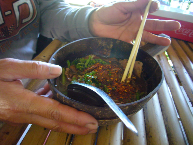 เที่ยงพอดีถึงปราจีน เข้าตลาด ไปหาญาติ ปาล์มมี่ จ่าดำ ก๋วยเตี๋ยวกะลา ใครผ่านไปต้องไปกิน รับประกันกะลาเดียวไม่เคยพอ แต่อย่าเผลอล่อหลายกะลาล่ะ มิฉะนั้นตังค์ไม่พอ อาจจะต้องขอยืมกะลา จ่าดำไปขอทาน