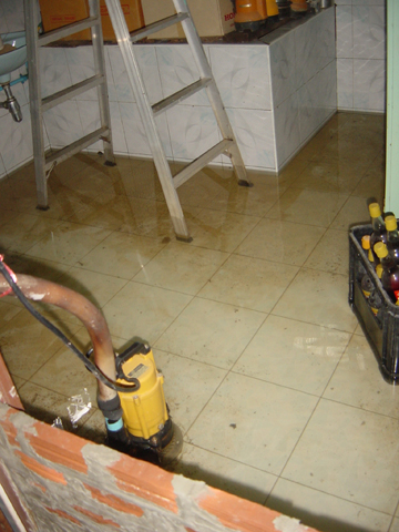 ห้องน้ำด้านล่างน้ำซึมเข้าเร็วมาก ก็ต้องก่อกันไม่ให้น้ำไหลออกมาห้องครัว และที่สำคัญต้องมีไดโว่สูบน้ำสำรองไว้เพื่อสูบน้ำออก ไม่ให้ระดับสูงเกินไป
