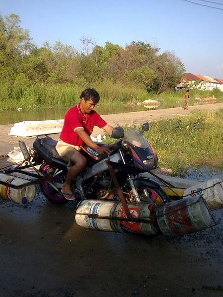 ไปเจอมาแถวบ้าน กำลังทดสอบ ลอยน้ำได้ แต่การเคลื่อนที่และบังคับเลี้ยว ไม่ผ่าน ไม่รู้ว่าตอนนี้พัฒนาไปถึงไหนแล้ว เป็นช่างผู้รับเหมาแถวหมู่บ้านชวนชื่น ตอนนี้เข้าใจว่าที่ที่แกพักอยู่ในแค้มป์คนงานคงน้ำท่วมสูงแล้ว