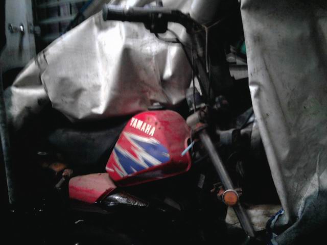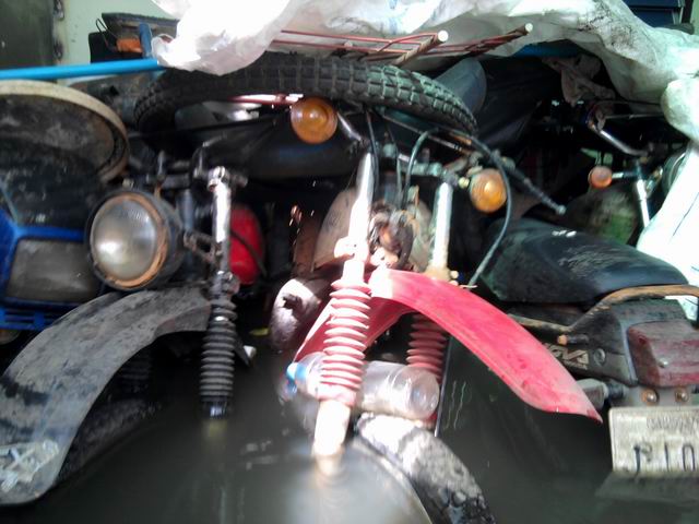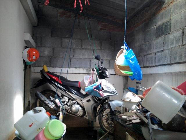 สปาร์ค135 คันใช้งานประจำ แขวนใว้เกือบได้ลงแล้ว เย้ เย้ ตอนแรกยกสูงด้วยการลองโต๊ะ น้ำท่วมถึงเบาะเลยแขวนต่อ แต่ก้อไม่รอด