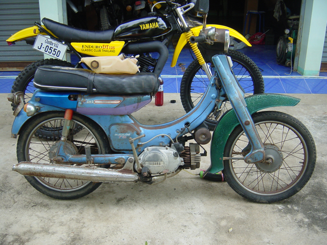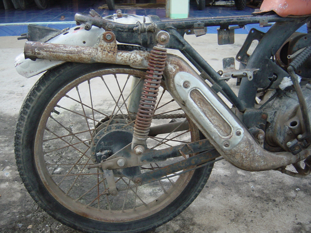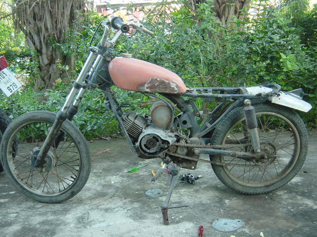 เมื่อวันที่ 7 ก.ค.ที่ผ่านมา ไปนั้งกินก๊วยเตี๋ยวตอนเที่ยงที่ร้าน 5อ. แถวตลาดสิงห์บุรี บังเอิญมองไปเห็นซากรถเก่า ๆ คันหนึ่งจอดไว้หน้าร้านซ่อมมอเตอร์ไซด์ และสะดุดตาอยู่ที่ท่อไอเสีย เห็นว่าสวยดี ก็เลยเข้าไปถามไถ่เจ้าของร้าน พี่แกบอกว่าเป็นรถลูกค้าขนชิ้นส่วนใส่เข่งมา 2 ใบ ให้ช่วยซ่อมและประกอบ เจ้าของร้านก็ดำเนินการให้ แต่ผ่านมาร่วม 2-3 ปีแล้วเจ้าของที่ขนมาก็หายจ้อยไม่มารับรถคืน เราก็บอกว่าสนใจท่อไอเสียเผื่อจะแยกชิ้นส่วนขาย จะเอาไว้เป็นอะหลั่ย และถามต่อว่าแล้วพี่จะทำยังไงในเมื่อเจ้าของไม่มารับรถแล้ว พี่แกก็บอกว่าคงต้องขายทิ้งเพราะติดต่อไม่ได้มาหลายปีแล้ว และเอาเฉพาะค่าอะหลั่ยที่ทำไปคือ 1,800 บาท เราก็เลยต่อ 1,500 บาทแล้วกัน จริง ๆ อยากได้เฉพาะท่อไอเสียจริง ๆ แต่แกบอกว่าถ้าซื้อไปรถมันใช้ได้น่ะ ก็เลยตกลงกันที่พันห้าร้อยบาท และเย็นจะมาขนกลับ (ซื้อซากรถอีกแล้วพี่น้อง)