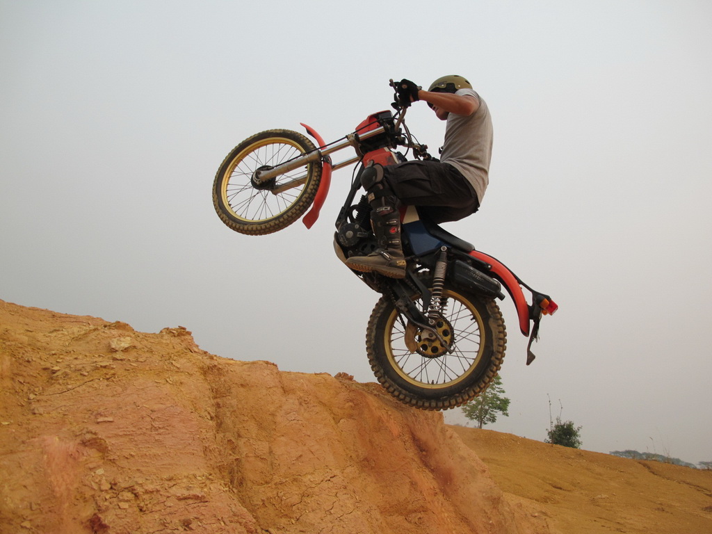 ...อย่าตกใจ..เวลาที่เรากับรถลอยกลางอากาศ หากล้อหน้าตั้งสูง อาจเนื่องจากลักษณะของเนินหรือหน้าตัด ให้รักษาสมดุลไว้ แล้วเบรคหลัง...อย่าตกใจทิ้งรถนะครับ..พอล้อหล้งลงแตะพื้น..ล้อหน้าก็จะลงตามไปเอง..เพราะเราเบรคหลังไว้แล้ว...แต่หากล้อหลังไปไม่พน้ขอบเนินก็..เตรียมใจได้เลย..รีบเอาเท้าลงพื้น แล้วพลิกรถนอนลงซ้ายหรือขวา..พักเท้าทิ่มลงพื้นจะช่วยให้หนักเป็นเบาส่วนตัวเราก็โดดลงตามสะดวกเลยครับ จังหวะนี้คนเซฟตี้ควรคว้าจับล้อหน้าหรือโช๊คไว้ครับ จะได้ไม่ตกลงไปซ้ำเพื่อน...หากแต่มีการเทสดูให้แน่ใจก่อนในจังหวะเกียร์..รอบเครื่องยนต์..และจังหวะการเทคตัวถ่ายเทน้ำหนักดีแล้ว..พลาดยากครับ หากแต่ถ้าขึ้นได้แล้ว..สนุกดีครับ กับรูปแบบการเล่นลักษณะนี้ เฮียป่าชอบนัก..แต่ผมนี่สิ..ต้องเป็นคนเทสก่อนเสมอๆหากเล่นได้แล้วก็ให้เพื่อนๆเล่นกันต่อไป..หากแต่ถ้าอันตรายเกินไปหรือมีจุดที่ต้องระวังตรงไหน ก็จะได้บอกเตือนเพื่อนๆครับ..ดั่งที่หลายๆคนรู้กันดี..แฮนด์หัก..บังโคลนแตกหรือตะกายสี่ขาลงมาก็มีมาแล้ว...ดีที่สุดคือมีเพื่อนคอยเซฟตี่ และตั้งสมาธิเรียงลำดับขั้นตอนต่างๆที่ต้องทำ...เร่งชาร์จเข้าไปจังหวะเทคตัวไปหน้า..เดินคันเร่ง..ตาดูที่ปลายเนิน..ชาร์จขึ้นไป.พอรถลอย..เบาคันเร่ง..ย่อเข่า..ดันแฮนด์ไปหน้า..ใช้เวลาแป๊ปเดียวเอง สนุกมากครับ...ลองเล่นกันดู กับเพื่อนๆมือใหม่ ที่พอมีทักษะกันแล้ว จะได้ฝึกเทคนิคเหล่านี้กันต่อไปครับ..พรุ่งนี้มีฝึกซ้อมกลางสัปดาห์ใครว่างเชิญ..ช่วงบ่ายแก่ๆ ส่วนสถานที่นัดกันอีกที...อาจกั้นไลน์เล่นกันนิดหน่อยครับ...