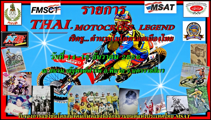 กำหนดวันเวลาแล้วสำหรับงานรำลึกถึงตำนานนักแข่งในเมืองไทยที่อำเภอพิมายในวันเสาร์ขอาทิตย์ที่ 14-15 ธันวาคม 2556 ณ.สนามณัฐพงศ์ฟาร์ม อ.พิมาย จ.นครราชสีมา เรียนเชิญทุกท่านมาร่วมทำบุญและตั้งกองทุนเพื่อนอดีตนักแข่งของเมืองไทย วันเสาร์ร่วมทำบุญตักบาตร ถวายเพลพระอุทิศให้กลับอดีตนักแข่งของเมืองไทยที่จากไป อาทิ ลุงอ๊อด อยู่พิมาย อริเรก แซ่ลิ้ม จอห์น อิสรัมย์ สัญญา เอี่ยมประเสริฐ บอย หนองแขม คริสมาส วิไลโรจน์ ฯลฯ ตอนเย็นพบปะสังสรรค์ชมวิติทัศน์นักแข่งในตำนานของเมืองไทย(โต๊ะจีน) วันอาทิตย์เชิญร่วมการแข่งขันโมโตครอสมิ๊ตติ๊ง เพื่อหารายตั้งกองทุนช่วยเหลืออดีตนักแข่งของเมืองไทย รายละเอียดรุ่นแข่งขันจะแจ้งให้ทราบอีกทีครับ