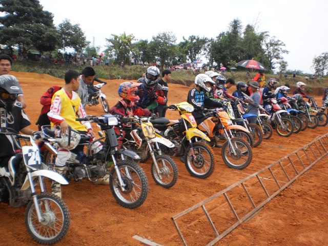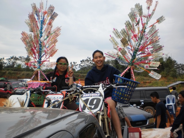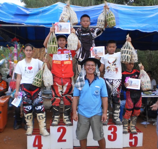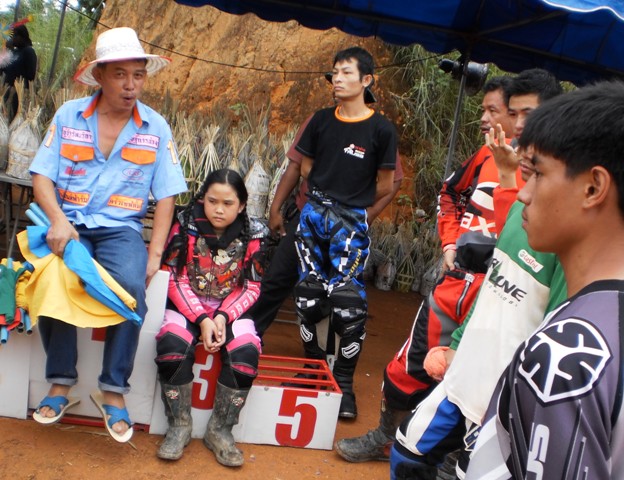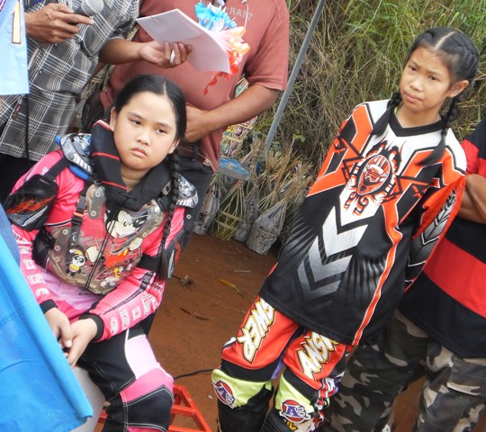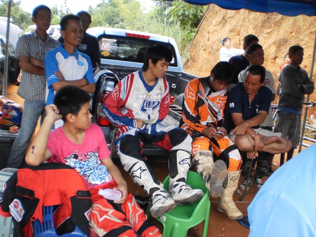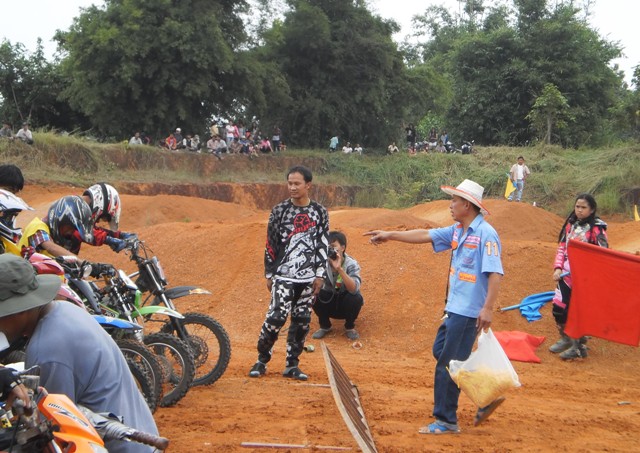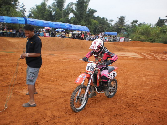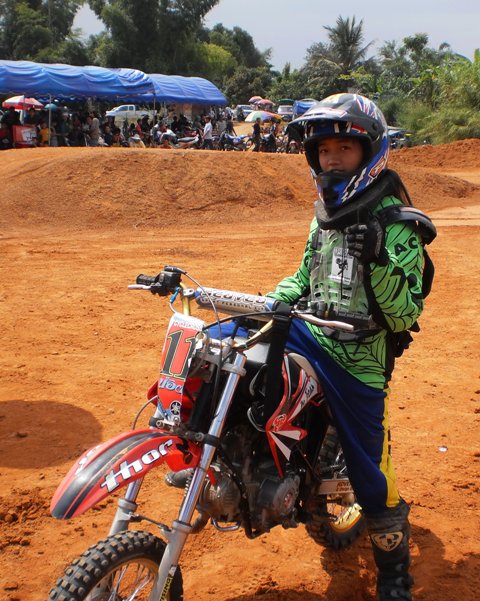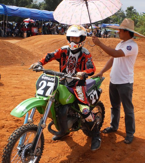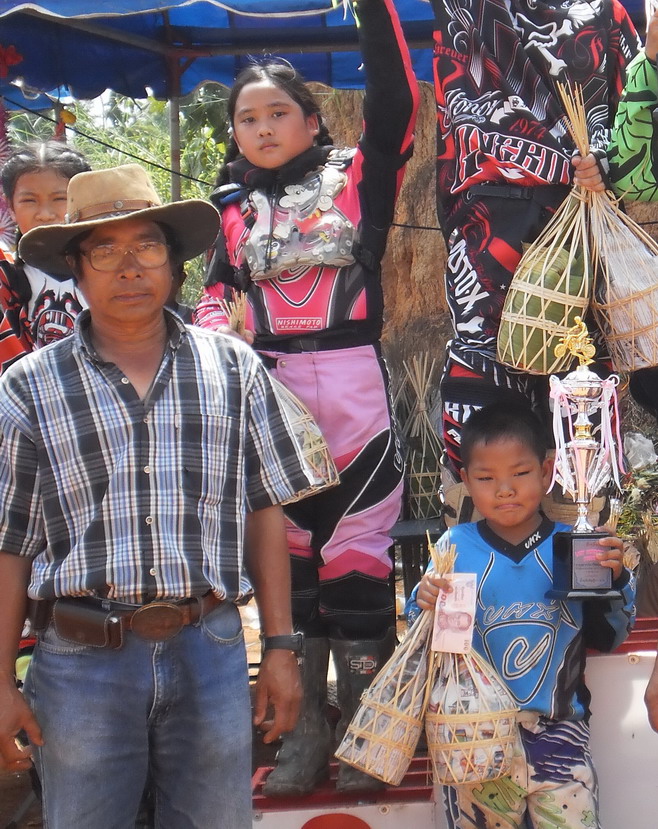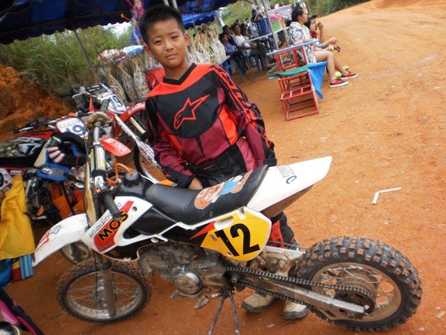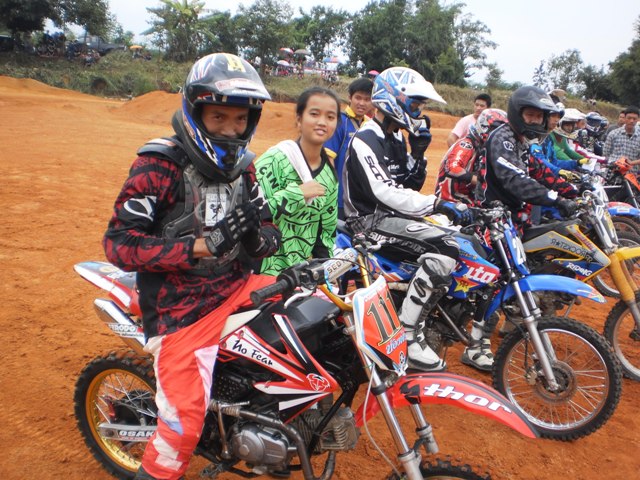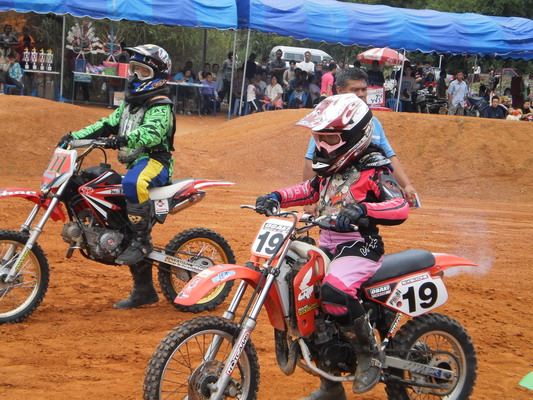 บรรยากาศก่อนการแข่งครับ หลังจากไปตานก๋วยสลากที่วัดมาแล้ว พี่น้องนักแข่งและทีมงานพร้อมทั้งพี่น้องชาวบ้านสันทราย ต่างก็หอบลูกจูงหลานมานั่งชมที่สนาม ในภาพ "หนูนิต" นักแข่งน้องใหม่ที่มีลีลาดุดันหลังจากพักการแข่งไปครึ่งปีก็หวลกลับมาอีกครั้งด้วยม้าคู่กาย CRF-150 โตกว่าเดิมซะอีก..