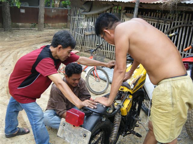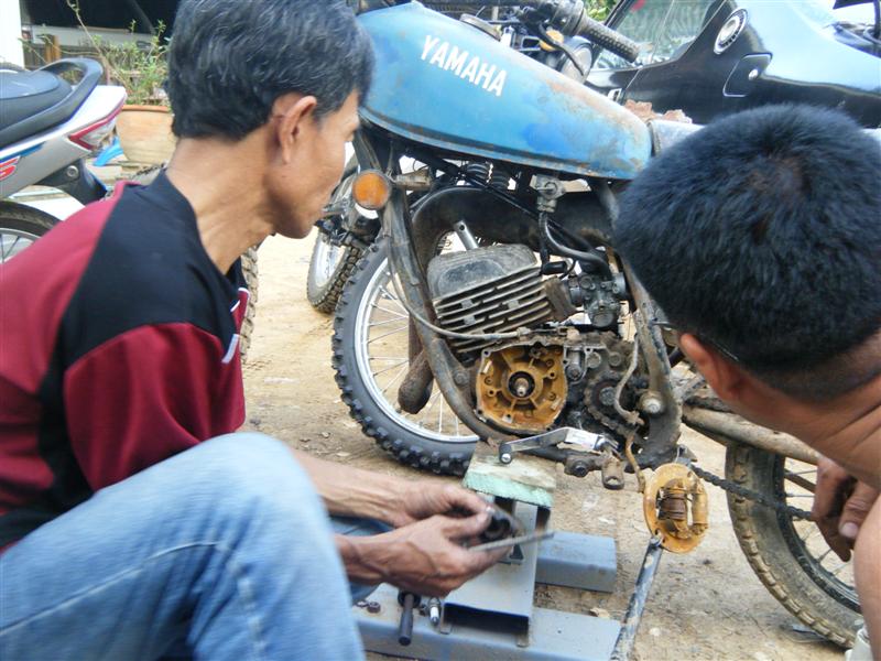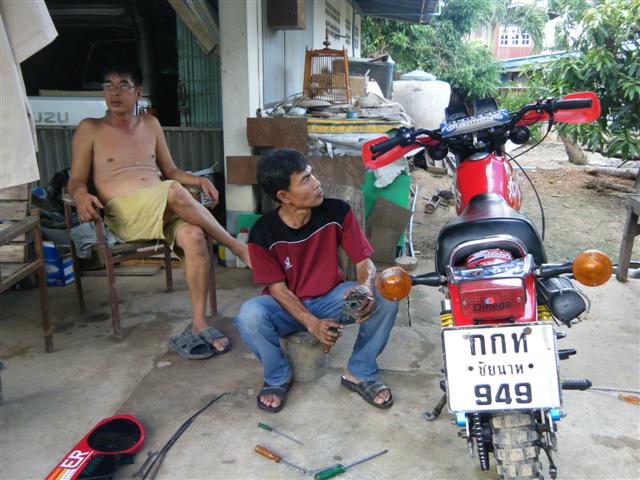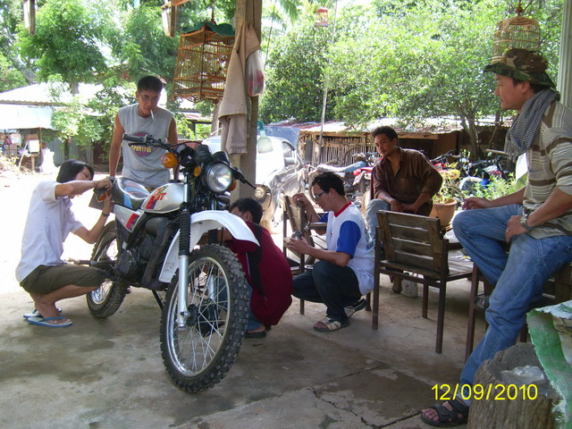 คำตอบที่ 94 ชาวคณะEnduro Classic Club Thailand มาพบปะกันก็ไม่มีเรื่องอะไรนอกจากเรื่องรถวิบากในภาพกำลังเปลี่ยนคาร์บูให้เสี่ยปอนด์ บ้านไร่ที่ควบ DT 125 มาจากบ้านไร่ร้อยกว่ากิโล สามชั่วโมงกว่าเจ้าของบอกว่าเดินเบาไม่ดี สุดท้ายเสร็จมือจูนเอาหัวใจของ DT 125 อีกคันก็ของเขาเองนั่นแหละที่ทำเสร็จแล้วใส่เข้าไป โดยมีคุณแดงพี่ใหญ่ใจดี เอก ชัยนาท สมาชิกเก่ายุกแรกๆนั่งอยู่ใกล้ๆ ตี้ กับกำลังเปลี่ยนไฟเลี้ยวหลังให้ สรุปผมการประชุมครั้งนี้ 1. เสื้อกลุ่มไว้ขับออกทริป ป็อบ 888 ดำเนินการออกแบบมาให้เลือกและสั่งทำ 2. ทริปหน้าเดือนตุลาคม หลังจากเจ้าของรถกลับไปแล้วผมได้จัดการสลายร่างรถของป็อบเรียบร้อยแล้ว เครื่องยนต์น้ำมันเบ็นซินเข้าเครื่องถ่ายออกมาได้ราวๆ1.5 ลิตรในสภาพน้ำมันใส่แจ๋วเป็นผลมาจากซีลลูกเบี้ยวครัชเสีย เช้าก่อนมาทำงานก็สลายร่างจนเจ้าของจำไม่ได้แล้ว คุยกับพี่ฉลองไว้คงเร่งให้ก่อนเพราะไม่มีรถขี่และมีคิวต่ออีกคันแต่มีข้อแม้ว่าเจ้าของเตรียมตังค์ไว้ด้วย น่าจะหนักที่โช้คหน้าหลัง เย็นนี้ก็ปฏิบัติการเจียร