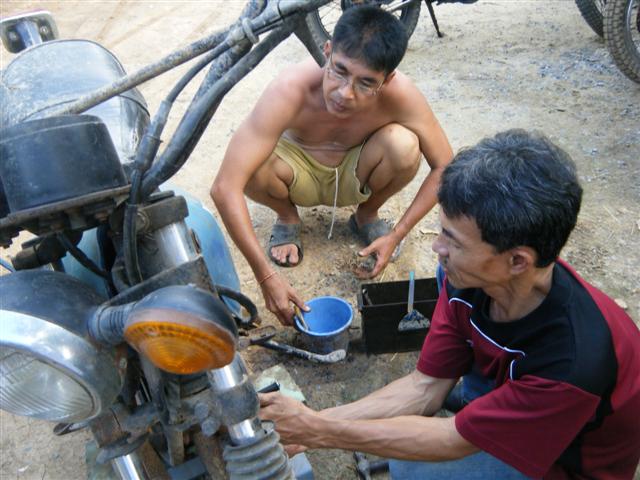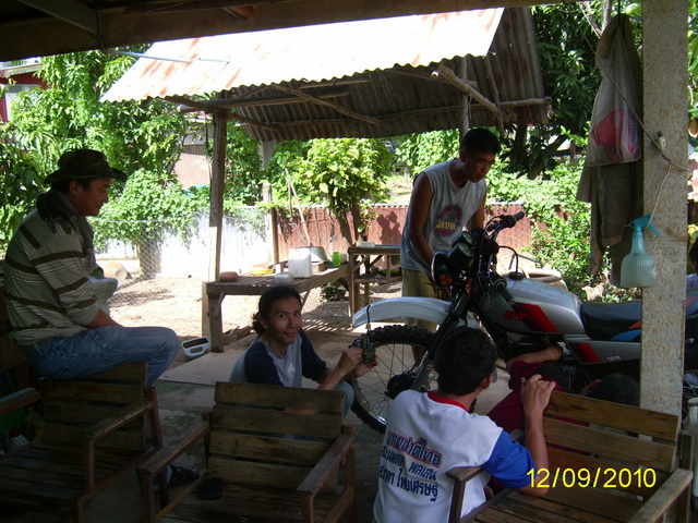คำตอบที่ 95 ชาวคณะEnduro Classic Club Thailand มาพบปะกันก็ไม่มีเรื่องอะไรนอกจากเรื่องรถวิบากในภาพกำลังเปลี่ยนคาร์บูให้เสี่ยปอนด์ บ้านไร่ที่ควบ DT 125 มาจากบ้านไร่ร้อยกว่ากิโล สามชั่วโมงกว่าเจ้าของบอกว่าเดินเบาไม่ดี สุดท้ายเสร็จมือจูนเอาหัวใจของ DT 125 อีกคันก็ของเขาเองนั่นแหละที่ทำเสร็จแล้วใส่เข้าไป โดยมีคุณแดงพี่ใหญ่ใจดี เอก ชัยนาท สมาชิกเก่ายุกแรกๆนั่งอยู่ใกล้ๆ ตี้ กับกำลังเปลี่ยนไฟเลี้ยวหลังให้ สรุปผมการประชุมครั้งนี้ 1. เสื้อกลุ่มไว้ขับออกทริป ป็อบ 888 ดำเนินการออกแบบมาให้เลือกและสั่งทำ 2. ทริปหน้าเดือนตุลาคม หลังจากเจ้าของรถกลับไปแล้วผมได้จัดการสลายร่างรถของป็อบเรียบร้อยแล้ว เครื่องยนต์น้ำมันเบ็นซินเข้าเครื่องถ่ายออกมาได้ราวๆ1.5 ลิตรในสภาพน้ำมันใส่แจ๋วเป็นผลมาจากซีลลูกเบี้ยวครัชเสีย เช้าก่อนมาทำงานก็สลายร่างจนเจ้าของจำไม่ได้แล้ว คุยกับพี่ฉลองไว้คงเร่งให้ก่อนเพราะไม่มีรถขี่และมีคิวต่ออีกคันแต่มีข้อแม้ว่าเจ้าของเตรียมตังค์ไว้ด้วย น่าจะหนักที่โช้คหน้าหลัง เย็นนี้ก็ปฏิบัติการเจียร