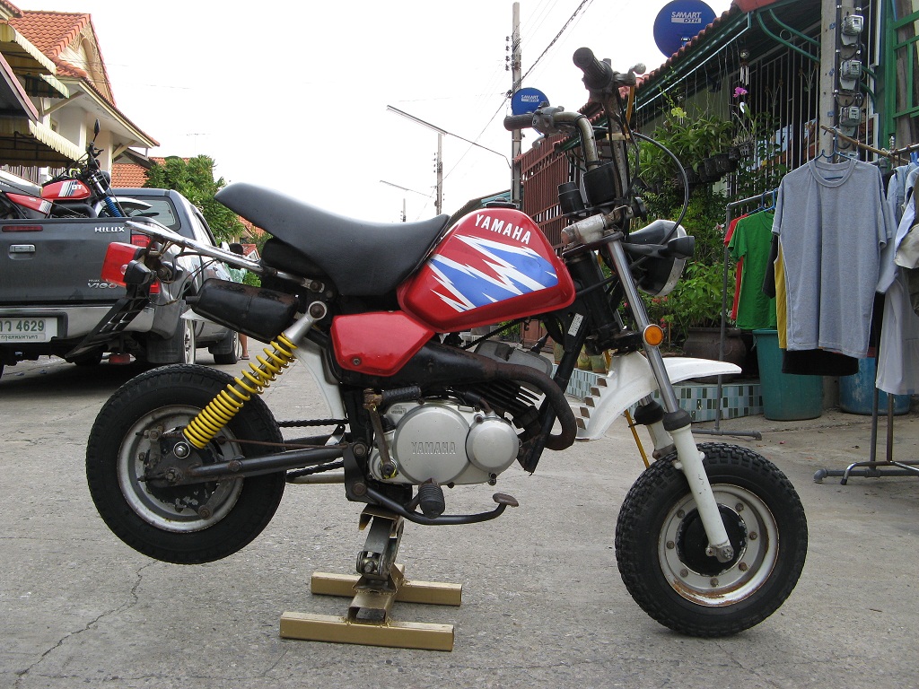 คำตอบที่ 146 คุณป๋อง+ต้องขออภัยครับผมเตรียมเสื้อผ้าไว้ว่าจะฝากคุณแดงกลับไปให้เพื่อร่วมบริจาคที่น่านด้วย แต่พอคุณแดงกลับผมลืมครับ ทีนี้ทำไงดี สำหรับการต่อโช้คหลังผมเองใช้วิธีดูที่เหล็กเสาค้ำสวิงอาร์ม คู่ที่ไปค้ำหูสวิงอาร์มบนที่มีรูใส่สลักยึดหูโช้คด้านล่างครับคุณป๋อง ดูให้เสาคู่นั้นมันขนาดกันกับเฟรมหลังของรถในขณะที่ล้อหลังแตะพื้นก็จะได้ความสูงที่ผมพอใจ อีกวิธีที่บางพื้นที่เขานิยมกันเนื่องจากมันง่าย คือการเจาะเฟรมถอยหลังมาจากรูร้อยสลักหูโช้คตัวบนก่อนถึงช่วงกลมของเฟรมประมาณ 2.5 ซม. (จากรูเดิม) ความสูงก็ลองดูรถของปอนด์ บ้านไร่คันสีเทาในหน้าที่ผ่านมา สำหรับสองวิธีการยกท้าย DT 125 MX ที่ผมกล่าวถึงหากได้ความสูงไม่พอให้หาแหวนรองโดยถอดหัวโช้คออกแล้วใส่แหวนรองเข้าไปสักสองสามตัวก็ได้ความสูงเพิ่มขึ้น แต่เราต้องต่อขาตั้งใหม่ครับ สำหรับขาตั้งขอแนะนำสมาชิกว่าไม่ต้องหาของตรงรุ่นหรอกครับเพราะมันบางผมเคบขับ DT 100 ไปงานศพจอดรถไว้พอจะกลับปรากฏว่ารถผมไปจอดพิงเสาไว้อย่างหมดเท่ห์ราศรีเหตุเพราะคนขึ้นไปนั่งแล้วขาตั้งมันแดะเอียงจนตั้งไม่อยู่ ปัจจุบันผมใช้ขาตั้งของ VR แล้วหาน็อตขาตั้งของฮอนด้ามาใส่เข้ากันพอดี ตัดตีนเป็ดด้านล่างสูงสักสองนิ่งแล้วใช้เหล็กปลายแฮนด์เก่าๆต่อเชื่อม 2 จุด ได้ความหนา ใหญ่แถมถูกกว่าของตรงรุ่น ลองทำดูครับคุณป๋อง