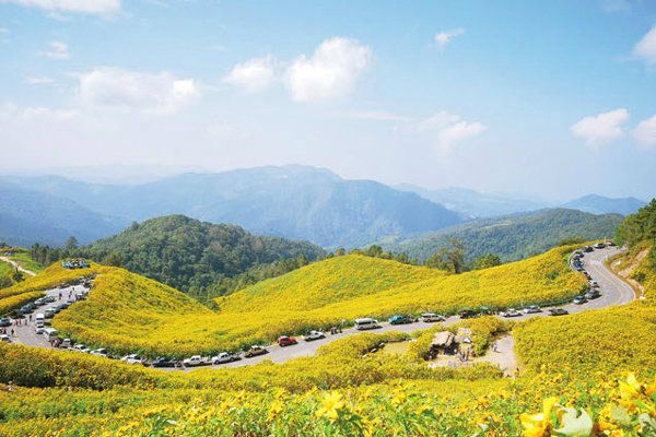 1.เส้นทางดอยแม่อูคอ จังหวัดแม่ฮ่องสอน เป็นเส้นทางคดเคี้ยวที่ขนาบข้างไปด้วยทุ่งดอกบัวตองที่กำลังผลิบานเหลืองอร่ามไปทั้งหุบเขาสวยๆ ตลอดเส้นทาง ยิ่งโดยเฉพาะในช่วงเช้าที่มีแสงอาทิตย์สาดแสงสีทองมากระทบกับดอกบัวตองด้วยแล้ว เป็นภาพที่งดงามเกินจะบรรยาย