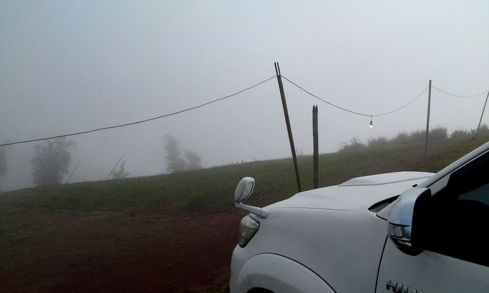 นั่งทานอาหารเช้าสักพัก มีกลุ่มหมอกลอยมาให้ที่ ที่เราพักอยู่ ทริปนี้ได้จับหมอก ดมหมอก แบบสะใจเลย