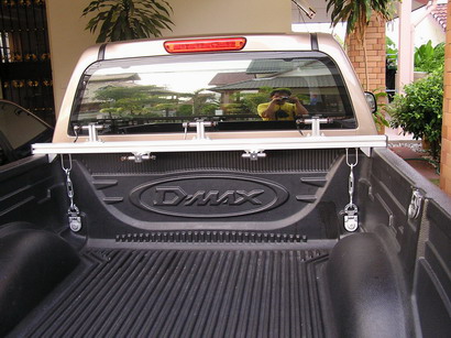 แบบแรก เป็นรางเหล็กพาดไว้บนขอบกระบะ แล้วทำตัวยึดลงมายึดกับหูเกี่ยวของ Max Liner สังเกตภาพในคำตอบที่ 6 ครับ ว่าจะมีฉากค้ำ กันเลื่อนซ้ายขวา ไว้กับของกระบะด้านใน ถ้าไม่มีตัวนี้เวลาเข้าโค้งแรง ๆ มันจะโยกซ้ายขวาได้ครับ