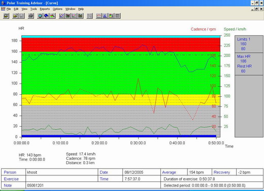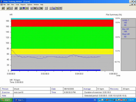 หลังจากซ้อมติดต่อกันมาเป็นเวลานาน วันนี้ช่วงเย็นเลยลองวัดชีพจรขณะพักของตัวเอง ด้วย HRM ของ Polar ซึ่งรุ่นนี้สามารถบันทึกข้อมูลและถ่ายลงสู่เครื่องคอมพิวเตอร์ได้ด้วย ชุดอุปกรณ์เสริม ( ชุดนี้มีผู้อุปการะคุณให้ผมมาใช้ ต้องขอขอบอีกครั้งครับ )