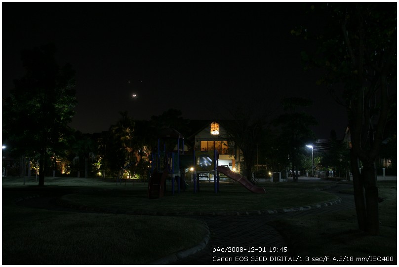กลับบ้านมาพอดี เสียงโทรศัพท์ จาก แม่บ้านบอกให้ตามมาที่สนามเด็กเล่นของหมู่บ้านบอกว่า น้องเต้กำลังเล็งถ่ายพระจันทร์ยิ้มอยู่สวยมาก ว่าแล้วก็รีบตามไปร่วมถ่ายภาพกับเค้าด้วย