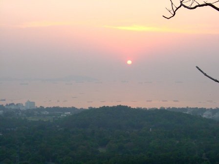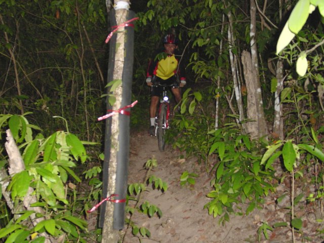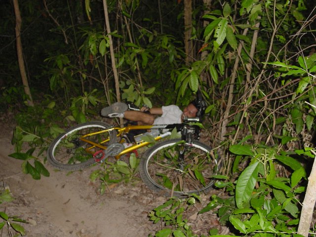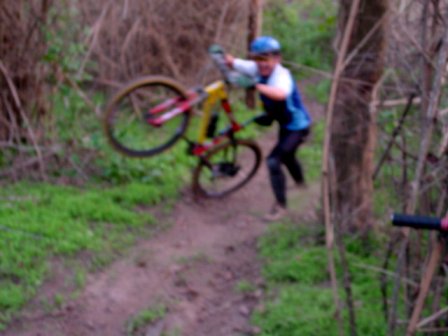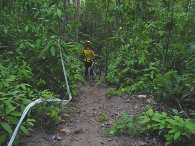 กว่าคุณบ้วยเข้ม อุ้ยไม่ใช่ บ้วยเค็ม จะขึ้นมาถึงก็เริ่มใกล้มืดแล้ว วันนี้มีกลุ่มอื่น มาดาวน์ฮิลล์กันหลาย กลุ่ม มีกลุ่มหนองมน ที่ขนเอารถ ดาวน์ฮิลล์โดยเฉพาะใส่ท้ายรถกะบะ ขึ้นไปปล่อยตัวกันเลย อีก 5-6 คัน กลุ่มเรา 8 กลุ่มไทยออลย์ 2+2 (+2 มาทีหลังแต่ลงถึงก่อนเรา HaHa พี่สุดใจกับลูกทีมอีก 1 นั่นเอง) นาย Trek คนแรกตามด้วย นายหมู นายแป๊ะยิ้ม แล้วนายหน่อย ส่วนหลัง ๆ ไม่รู้ว่าใครเป็นใคร ทางลงช่วงแรกก็ประเดิมด้วย 2 ตกใจก่อนเลย แล้วข้างล่างจะเป็นอย่างไรคิดกันเอาเอง หลังจากทางลงทางจะเป็นทางแบบ ลง ลง ขึ้น ลง ขึ้น ขึ้น แล้วก็สามตกใจ ช่วงมีหินดักข้างหน้าให้หักหลบ และเป็นช่วงดิ่งแบบเบรคไม่ค่อยอยู่ที่อาจารย์เข้มเคยมุดกอไผ่ไปครั้งที่แล้ว ส่วนผมเที่ยวนี้เล่น เอานาย Trek ต้อง ตะลึง ไปเลย HaHa ลงอย่างเร็วแบบไม่ตั้งใจ เพราะทั้งล้อหน้าล้อหลังมันล๊อกแล้วแต่ความเร็วมันไม่ยอมลดเสียหลักทำท่าจะเสียบนาย Trek ที่รอถ่ายรูปอยู่ แต่ก็สามารถประคองตัวหลบได้ แต่ก็เสียหลักต้องเอาขาลงแลนดิ้ง แถวยกหน้าโชว์อีกต่างหาก (โปรดดูภาพประกอบ) ตามหลังลงมาก็ทีมไทยออยล์ ที่ลงมาอย่างเร็วแถมล้มใกล้ ๆ ตอไผ่ เอื๊อก เห็นว่าเสียวแทน จริง ๆ ตามด้วยนายหน่อยที่ลงมาได้นิ่งมาก ข้างหลังรายกันต่อก็แล้วกันเพราะไม่ได้รอดู หลังจากนั้นก็ลงมารอกันจุดชมวิว ตรงจุดลงจุดชมวิว เอามาติดได้งัย 3 ตกใจ น่าจะเป็น 8 ตกใจมากกว่า เพราะถ้าพลาดมีสิทธิ์ว่าเพื่อนฝูงจะยกย่องเทิดทูล และต้องกราบไว้ไม่น้อยกว่า 3 วันแน่ ๆ